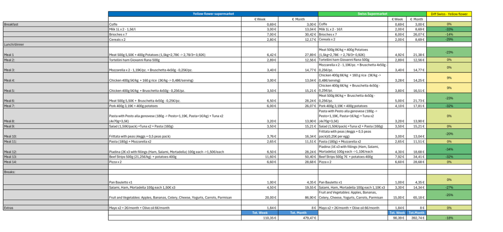 Spoiler: il supermercato Svizzero ha stracciato gli altri due e, secondo i miei umili calcoli, ci permette di rimanere comodamente entro il budget.