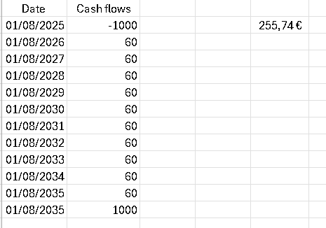 Supponiamo di voler valutare un investimento, come un’obbligazione, che acquistiamo oggi per 1000€, paga una cedola del 6% ogni anno per 10 anni e poi restituisce il capitale investito alla scadenza.