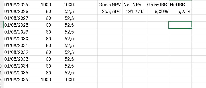 Come puoi vedere, il risultato del VAN è 255€, il che indica il valore attuale di questo investimento. Quindi, in termini reali, l’investimento vale 255€ anche se la somma nominale dei flussi di cassa è 1600€.